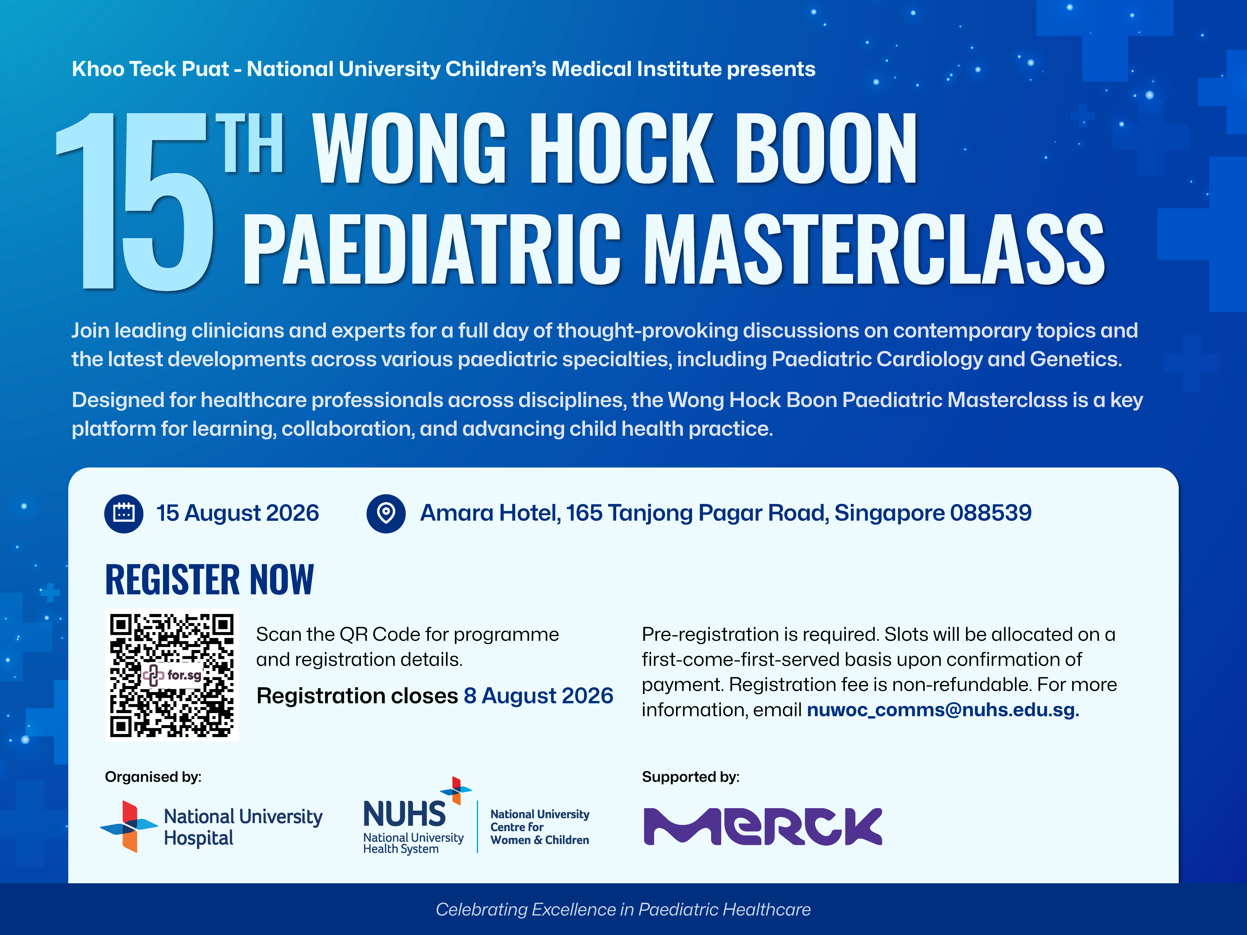 Join us for the 15th Wong Hock Boon Paediatric Masterclass, a flagship event organised by the Department of Paediatrics, Khoo Teck Puat – National University Children’s Medical Institute, on 15 August 2026!