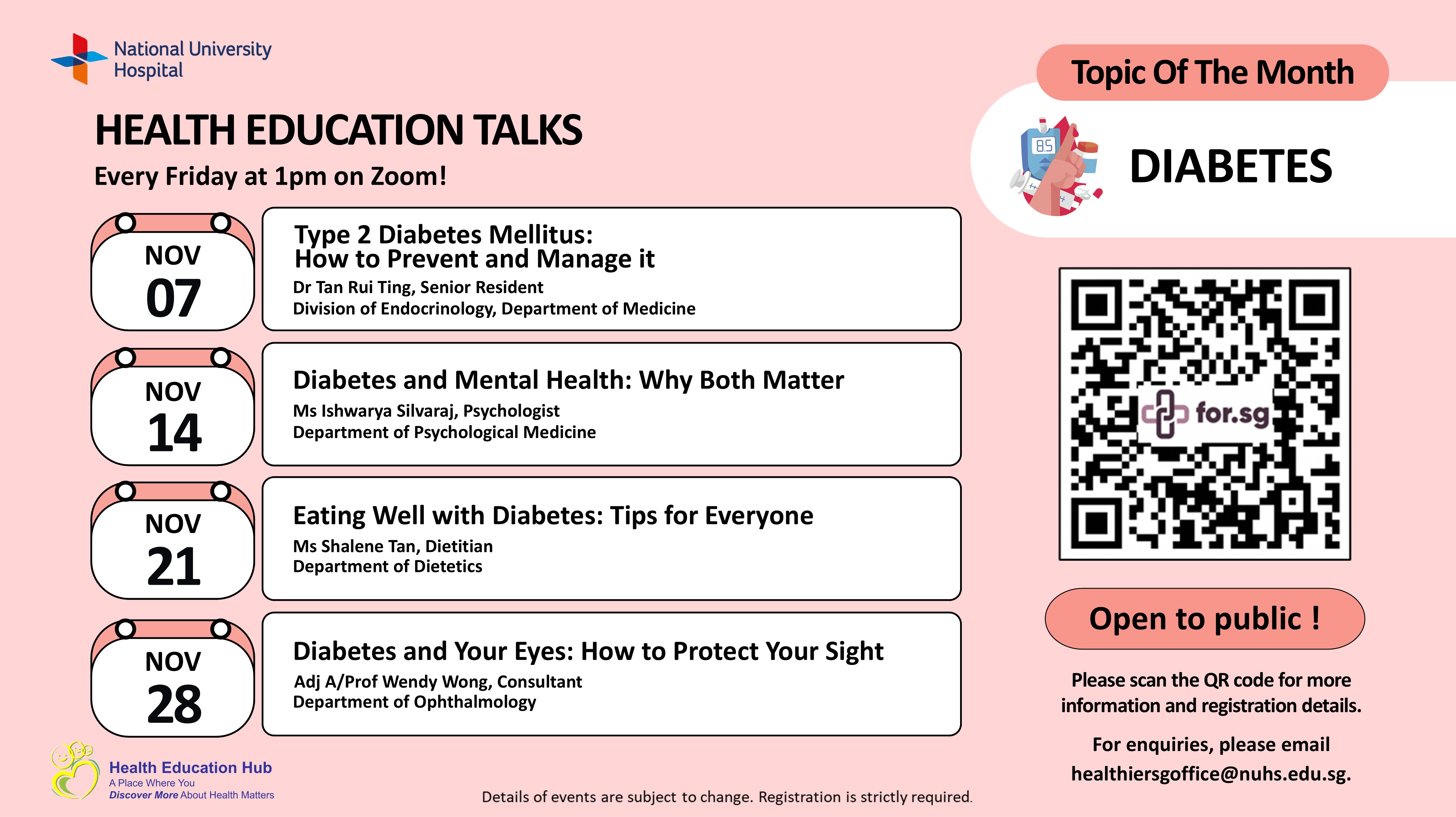 Did you know that diabetes now affects 1 in 10 people in Singapore, and we are seeing it in more younger adults than before? The good news is that Type 2 diabetes mellitus can often be prevented or delayed with early detection. However, poor control can lead to complications. In this talk, we will explore how to spot the warning signs, understand your risk factors, and take steps to manage this condition.