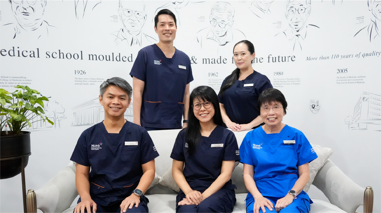 From left: Adj A/Prof Adrian Kee (NUH), Adj A/Prof Samuel Ow (NCIS), Adj A/Prof Amelia Santosa (NUH), Dr Ada Teo (NUH) and Ms Lim Suan Tee (NUH) are part of the team driving Appropriate Care efforts in delivering patient-centred care that maximises health outcomes and quality of life.