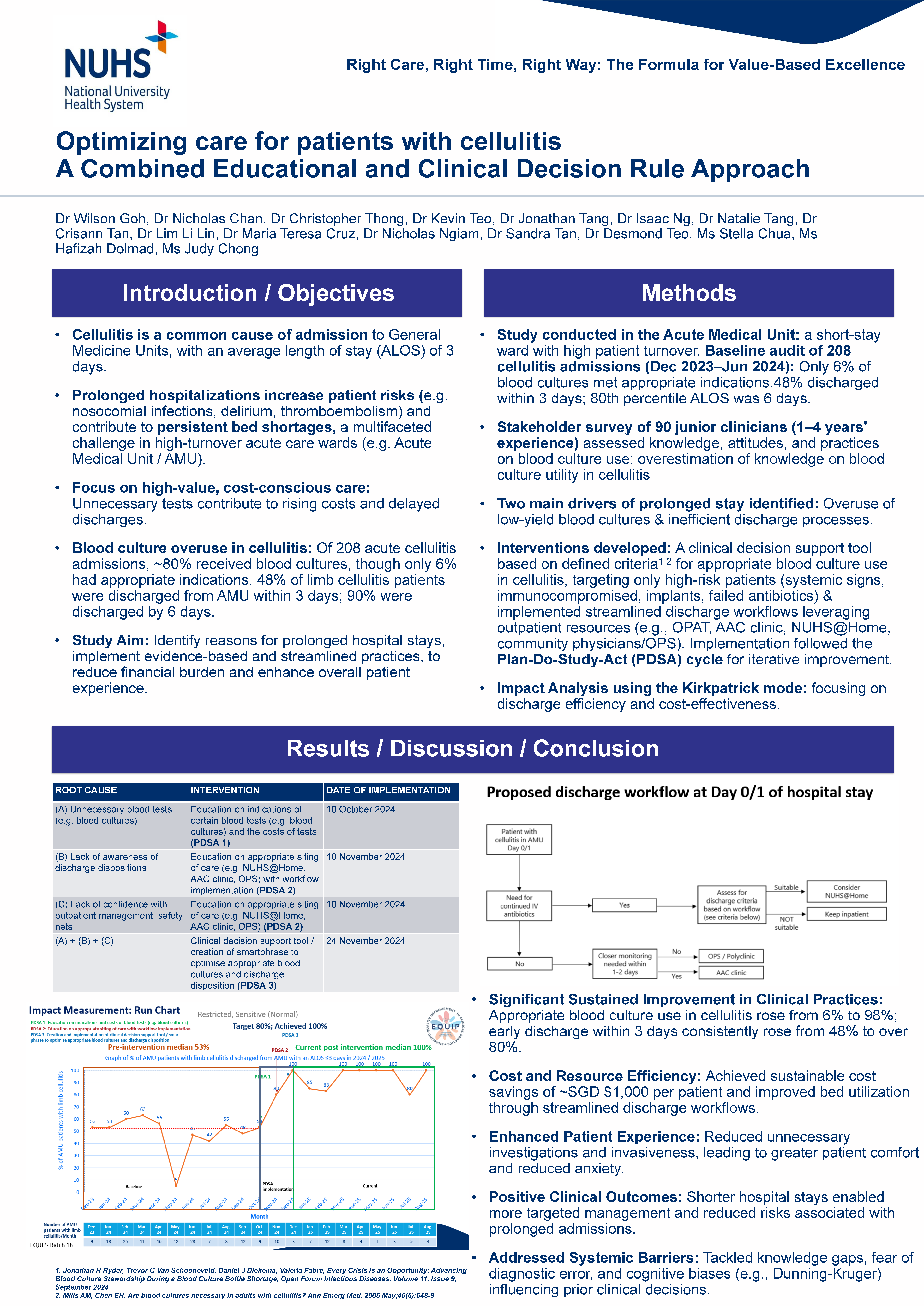 The challenge: Patients admitted with cellulitis frequently experience hospital stays that exceed the expected length of stay, increasing their risk for hospital-acquired infections and contributing to bed shortages. Additionally, there is notable overuse of low-yield investigations such as routine blood cultures, which add to unnecessary cost and resource utilisation.