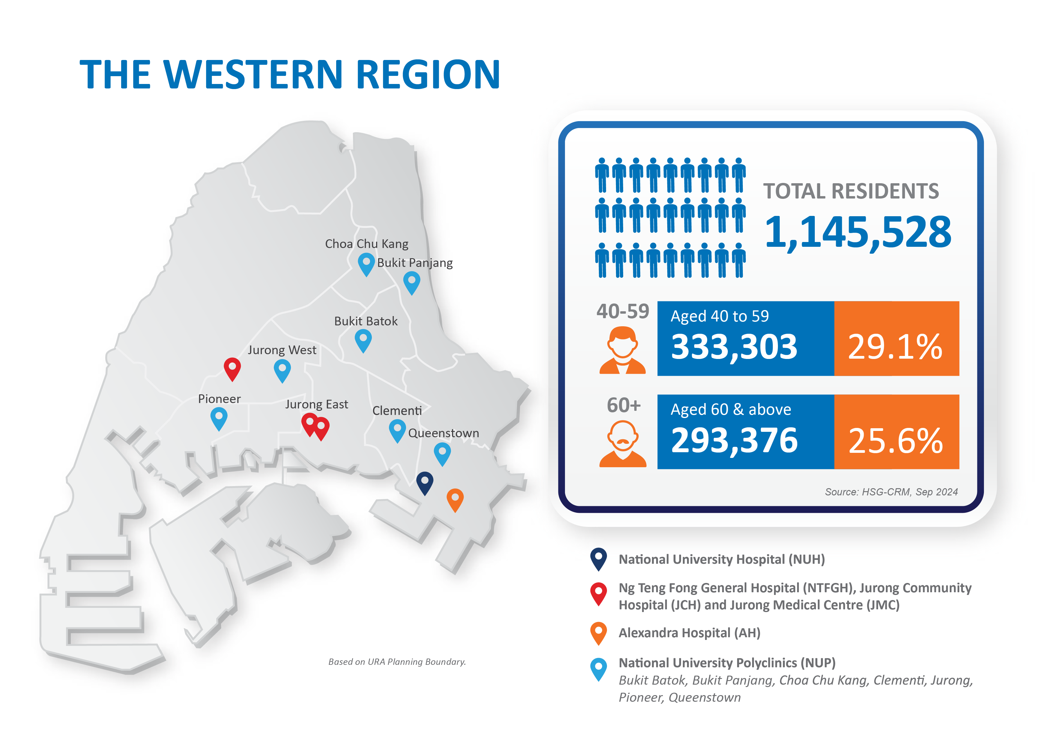 The National University Health System (NUHS) serves as the Regional Health Manager for the western region of Singapore, caring for 1.14 million residents. Our role goes beyond providing medical treatments, we bring together hospitals, polyclinics, general practitioners, and community partners to build an integrated ecosystem of care.