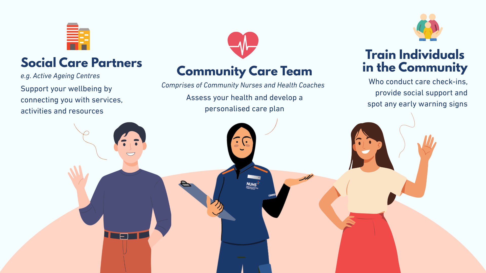 An integrated approach where NUHS Community Care Team, social care partners (e.g. Active Ageing Centre), and trained individuals from the community form one coordinated support system to help residents manage their chronic conditions and stay well in the community.